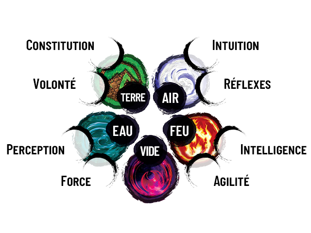 Le VIDE symbolise l'absence et la présence des quatre autres éléments. On ne retrouve cet élément pratiquement que chez les humains car il représente l'étincelle divine en eux.